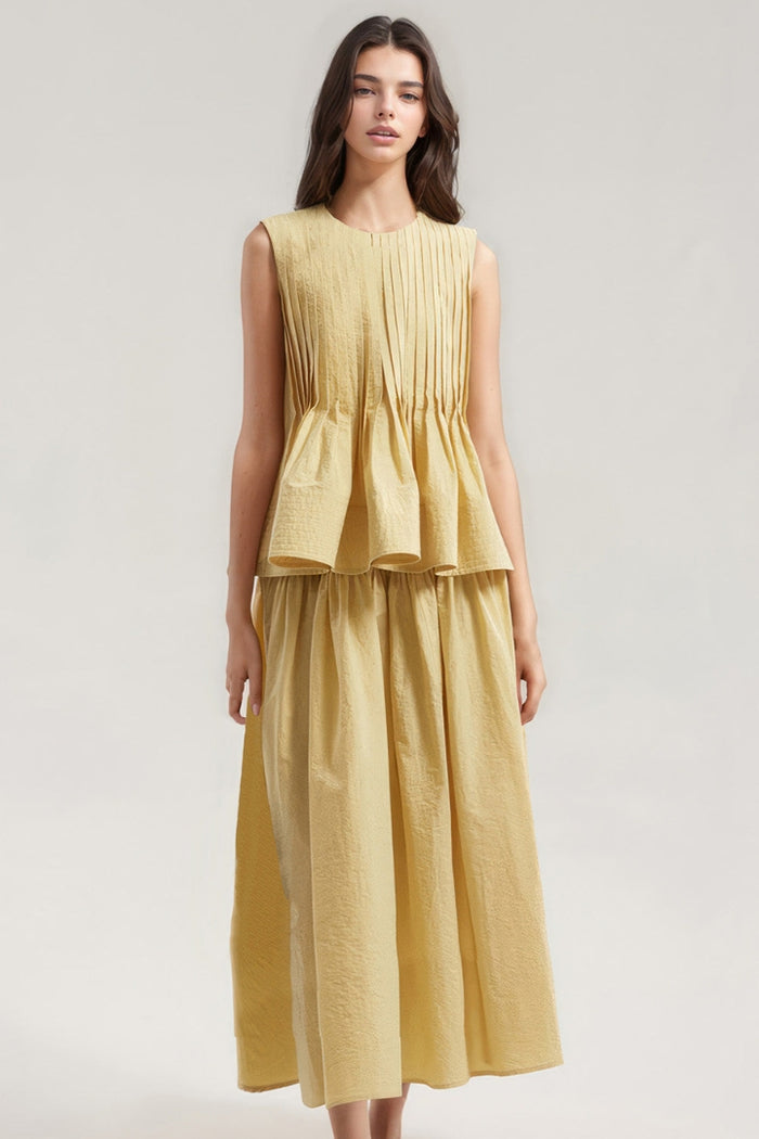 Dieses plissierte zweiteilige Set ist die perfekte Kombination aus klassischem und modernem Stil. Es inspiriert zu müheloser Eleganz. Das ärmellose Oberteil mit Rüschendetail und rundem Ausschnitt wird durch einen plissierten Midirock mit tailliertem Schnitt abgerundet. So entsteht ein zeitloser Look, der alle Blicke auf sich zieht.
