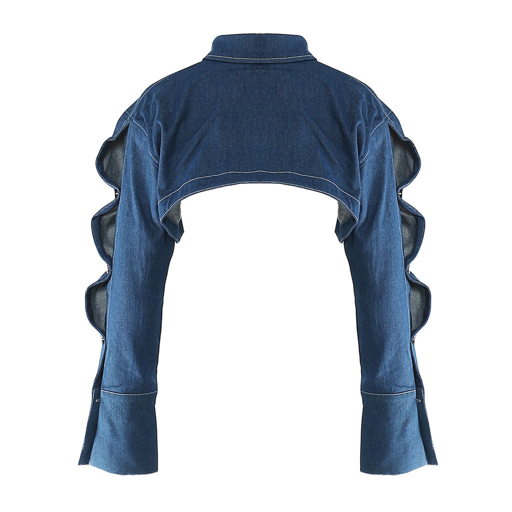 Diese kurze Jeansjacke in Blau ist Street-Chic pur! Der Umschlagkragen, die langen Ärmel mit gewelltem Saum, Knopfverschluss und breiten Manschetten versprühen einen coolen Style. Mit einer Drei-Knopf-Leiste und einem ultrakurzen Saum mit zusätzlichen aufgesetzten Taschen steht diese Designerjacke ganz im Zeichen des verkürzten Denim-Stils mit Knopfleiste. Nicht zu vergessen die Kontrastnähte, die für das gewisse Extra sorgen! Ein absoluter Hingucker! Perfekt für den lässigen Streetstyle-Look!