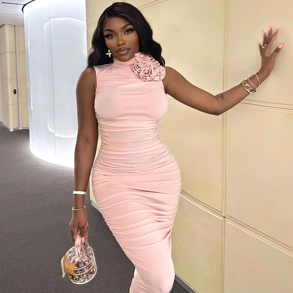 Magische Pink-Power! Unser neues Designerkleid ist immer die richtige Wahl, wenn du etwas Stilvolles für unterwegs brauchst! Die neue Saison präsentiert uns dieses pinkfarbene Kleid mit durchgehender Rüschenpartie, das deine Kurven perfekt in Szene setzt. Das ärmellose Midikleid ist mit einer hübschen Blumenrosette am hohen Ausschnitt verziert und verleiht ihm einen eleganten Touch. Der verdeckte Reißverschluss auf der Rückseite sorgt für ein einfaches An- und Ausziehen. Hinterlasse einen unvergesslichen Eindruck in diesem exquisiten Design. Dezente Kitten Heels passen besonders gut dazu.