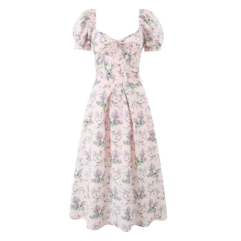 The **Rosé Picnic Dress** is an elegant floral design with puff sleeves and a flattering fit-and-flare silhouette. Its soft pastel pink color and lightweight fabric make it perfect for a sunny day picnic or an outdoor event.