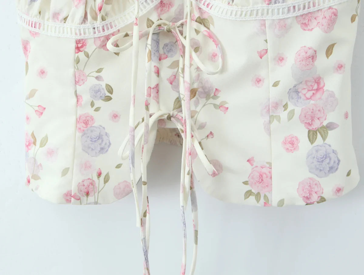 The Rose Road Top features a feminine and flirty design with soft floral print and a flattering corset-style tie-up front. Its stretchy. comfortable fit and delicate ruffle sleeves make it a perfect piece for casual outings and romantic looks.
