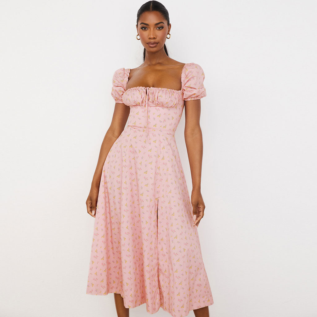 Trauen Sie sich und wagen Sie etwas Neues mit diesem süßen und sexy bedruckten Sommerkleid. Es besteht aus Baumwollmischgewebe und Polyester und besticht durch sein Blumenmuster. Der quadratische Ausschnitt mit gerüschtem Kordelzug und ein Schlüssellochausschnitt auf der Brust runden das Design ab. Der figurbetonte Schnitt mit verdeckten, elastischen Puffärmeln und der Reißverschluss hinten runden das Kleid ab. Die besonders lange Länge wird durch einen dramatischen Seitenschlitz betont. Entdecken Sie weitere einzigartige Sommerkleider und trendige Kleidung für Damen in unserer Boutique. Vervollständigen Sie Ihren süßen französischen Stil an sonnigen Tagen mit hohen Sandalen oder im Herbst und Winter mit einer Jacke und Absatzstiefeln.