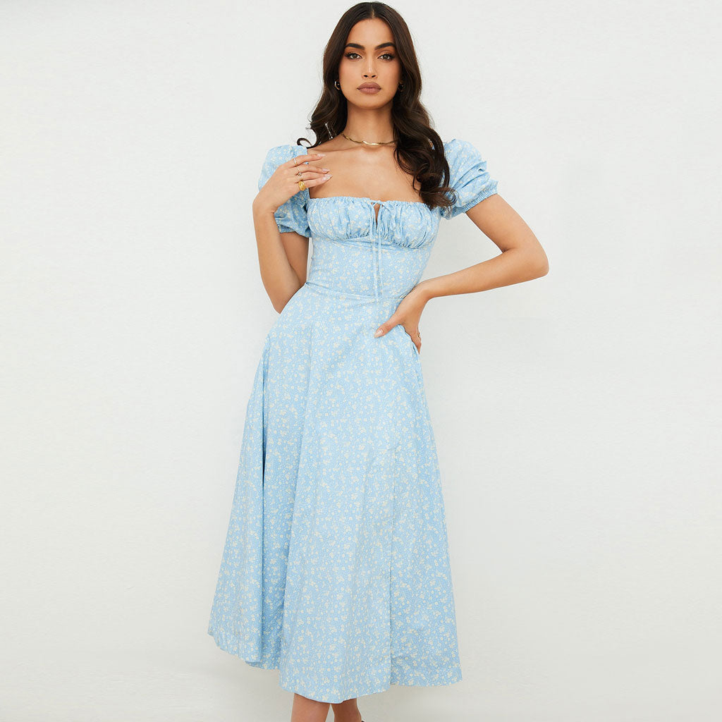Trauen Sie sich und wagen Sie etwas Neues mit diesem süßen und sexy bedruckten Sommerkleid. Es besteht aus Baumwollmischgewebe und Polyester und besticht durch sein Blumenmuster. Der quadratische Ausschnitt mit gerüschtem Kordelzug und ein Schlüssellochausschnitt auf der Brust runden das Design ab. Der figurbetonte Schnitt mit verdeckten, elastischen Puffärmeln und der Reißverschluss hinten runden das Kleid ab. Die besonders lange Länge wird durch einen dramatischen Seitenschlitz betont. Entdecken Sie weitere einzigartige Sommerkleider und trendige Kleidung für Damen in unserer Boutique. Vervollständigen Sie Ihren süßen französischen Stil an sonnigen Tagen mit hohen Sandalen oder im Herbst und Winter mit einer Jacke und Absatzstiefeln.