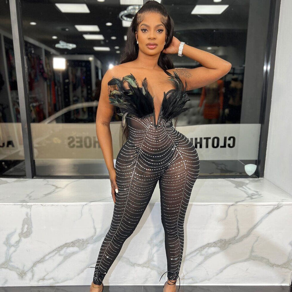 Dieser nostalgische, transparente Catsuit erinnert an den Glamour der 80er Jahre. Die halbtransparenten Details spiegeln den ikonischen Stil dieser Ära wider. Der tiefe herzförmige Ausschnitt mit veganen Federn und schimmernden, silberfarbenen Strasssteinen strahlt fesselnde Opulenz aus. Der elegante, schwarze, figurbetonte Einteiler mit transparentem Netzgewebe bietet eine moderne Interpretation der Retro-Ästhetik. Perfekt kombiniert mit einem String-Top, verkörpert er Eleganz pur. Perfekt zu High Heels für Vintage-inspirierte und zugleich avantgardistische Looks.
