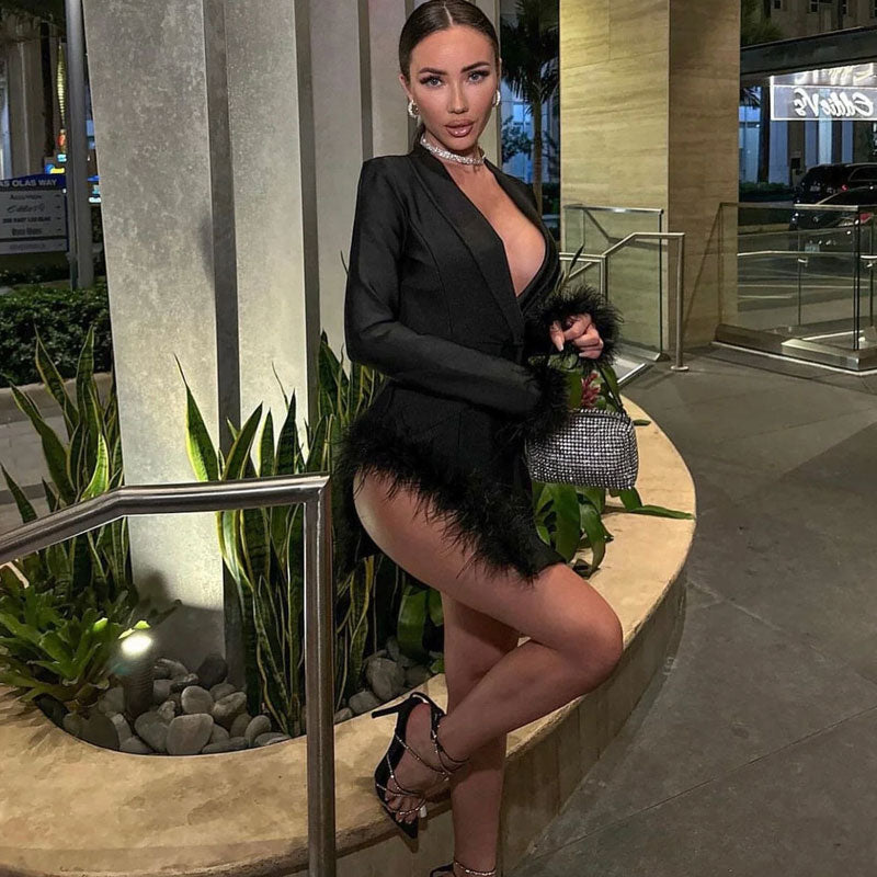 Heben Sie sich in diesem Blazerkleid von der Masse ab! Mit seinem festlich-erhabenen Element und dem schaumigen Kunstfederbesatz an Ärmeln und Saum ist dieses Kleid eine Krepp-Kreation mit gehobenem Look. Das ideale Outfit für Clubbing oder Mädelsabende. Der moderne Schalkragen gibt den Blick auf einen tiefen V-Ausschnitt frei. Das figurbetonte Kleid hat einen verdeckten Reißverschluss hinten, strukturierte Schulterpolster und Konturnähte entlang des Oberteils, wodurch es wie eine zweite Haut sitzt. Der strategisch platzierte Schlitz an der Seite betont Ihr Bein und sorgt für einen besonders sexy Eindruck. Tragen Sie dazu die passenden Pumps und die Clutch und seien Sie bereit für Komplimente.