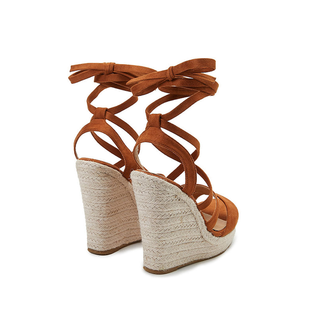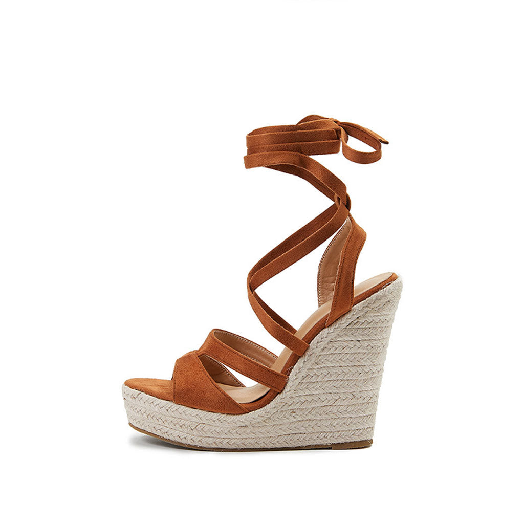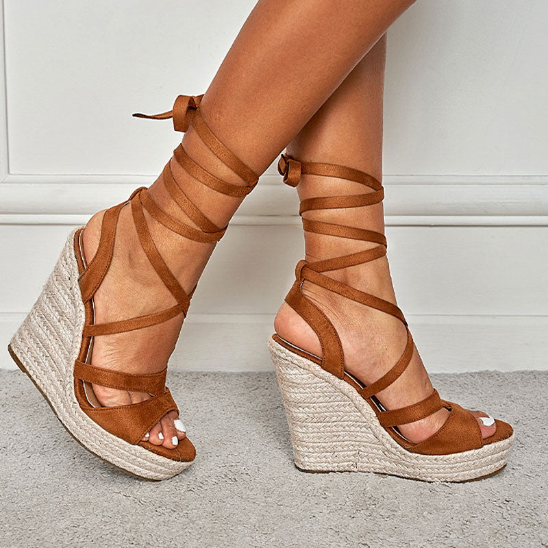 Mit diesen Riemchensandalen verleihen Sie Ihren Schuhen einen verspielten und verspielten Touch! Das aufgepeppte Wildleder-Imitat und die geflochtenen Jute-Absätze verleihen ihnen einen spätsommerlichen Touch. Die Keilabsätze bieten mit ihren schweren Plateaus eine stabile Höhe, die Sie hochheben, ohne dass Sie die Schmerzen von Stilettos verspüren. Sie werden die langen Bänder lieben, die sich zart an Ihren Fuß und Knöchel schmiegen und Ihre Beine für einen verspielten, gehobenen Look umschlingen. Binden Sie die Wildlederbänder tief um Ihren Knöchel oder kreuzen Sie sie hoch auf Ihrer Wade für einen sexy Style. Schwarz oder Braun. Jede der Farboptionen passt perfekt zu superfemininen Kleidern, zum Beispiel mit Blumenmustern.