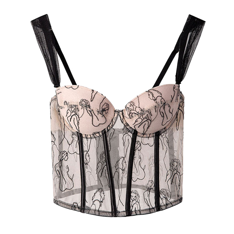 In diesem charmanten Oberteil werden Sie alle Blicke auf sich ziehen! Dieses Designer-Crop-Top aus atmungsaktivem Mesh-Material im Korsett-Stil besticht durch einen strukturierten, herzförmigen Ausschnitt mit Stäbchen. Herausnehmbare Polster und Push-up-Bügel sorgen für eine figurformende Passform. Die Porträtstickerei und die abnehmbaren Träger sind verstellbar und verleihen Ihrem ultrafemininen Look durch das Halbnetz-Detail einen stilvollen Touch. Der Haken-Ösen-Verschluss auf der Rückseite sorgt für sicheren Halt. Kombinieren Sie es mit einer schwarzen Hose und sexy Heels für einen modernen Göttinnen-Look.
