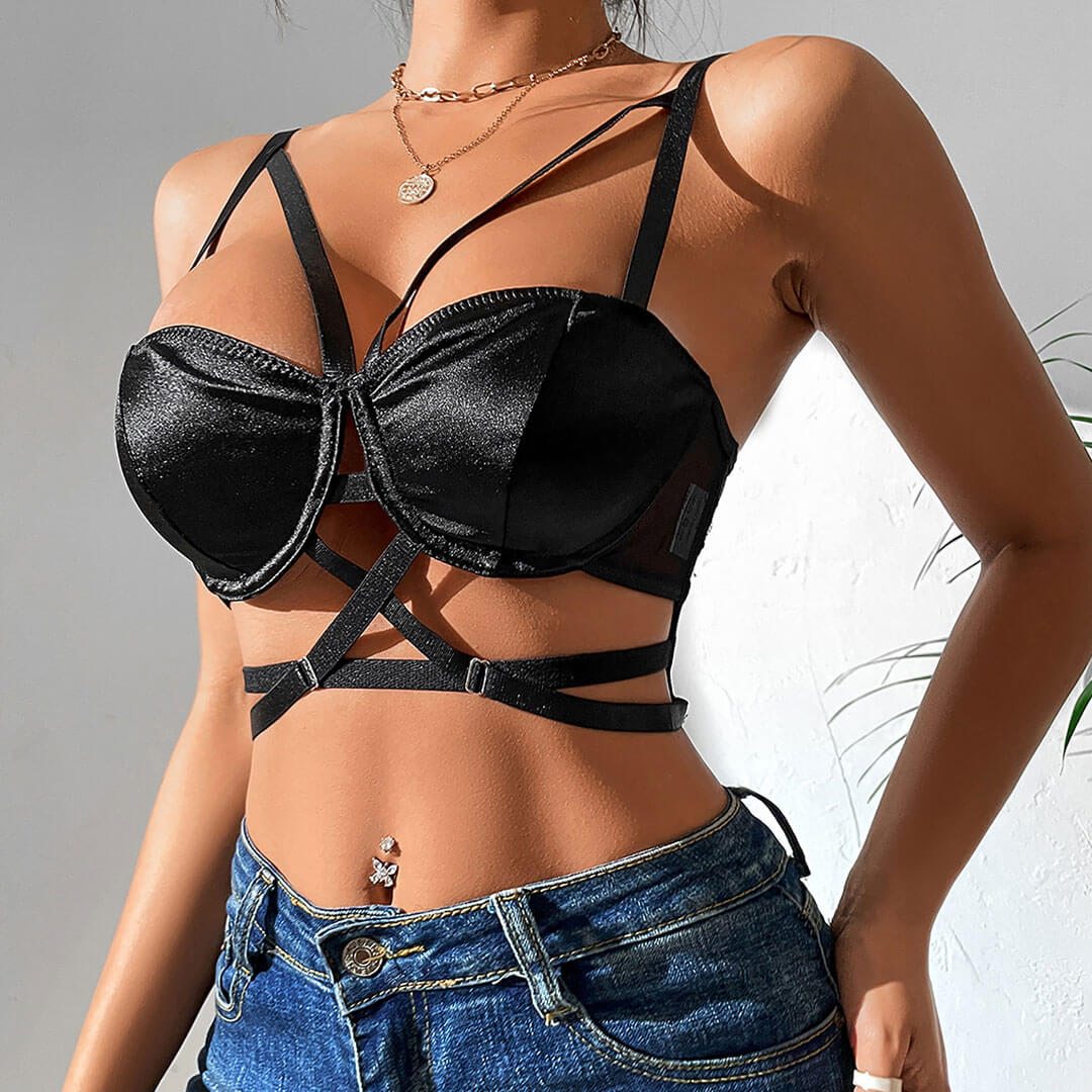 Romantisches Bra-Top für Sie. Einzigartig und absolut trendy. Dieser ärmellose Bandage-BH ist ein echter Hingucker. Das figurbetonte Oberteil zum Überziehen, vorne mit verstellbaren Trägern verziert, verleiht einen verführerischen Touch und sorgt für eine perfekte Passform, die Ihre Kurven betont. Der halbtransparente Netzrücken verleiht dem Ganzen einen Hauch von Eleganz. Er gibt verführerisch einen Blick auf die Haut frei und bewahrt gleichzeitig einen Hauch von Geheimnis. Mit seinem ultrakurzen Saum strahlt dieses sexy Bra-Top Frechheit und Selbstbewusstsein aus. So setzen Sie überall ein Statement. Die perfekte Kombination aus Spaß und Flirt! Lasst uns romantisch werden!