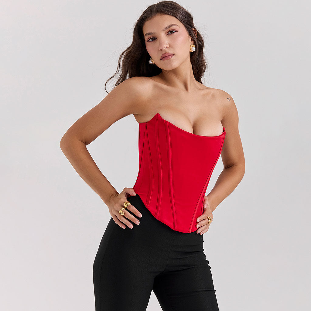 Dieses trägerlose Designer-Korsett ist ein echter Hingucker und eleganter Begleiter. Mit seinem markanten herzförmigen Ausschnitt und der verspielten Schnürung am Rücken zieht dieses kurze Tube-Top alle Blicke auf sich und bietet eine maßgeschneiderte Passform. Der raffinierte, geschwungene Saum betont Ihre Silhouette mühelos. Ob Sie ins Nachtleben eintauchen oder einen mutigen Auftritt hinlegen – dieses Highlight verleiht Ihrem Stil mit Selbstvertrauen und Eleganz das gewisse Etwas.