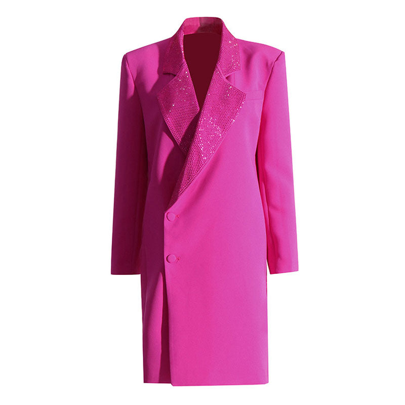 Dieser luxuriöse Longblazer ist der absolute Winter-Hingucker! Erhältlich in Schwarz oder Pink. Er ist der ultimative Winter-Glamour. Das Besondere: Ein auffälliger Reverskragen mit funkelnden Strasssteinen. Mit langen Ärmeln und geknöpften Manschetten sorgt diese kastige Jacke für den nötigen Chic. Und vergessen Sie nicht die Schulterpolster und die Zwei-Knopf-Leiste! Der Schnitt ist locker. Und ein Tipp: Für Frauen mit großer Oberweite ist eine Nummer größer empfehlenswert. Dieser Designer-Blazer für Büro und Party ist nicht nur ein Mantel; er ist Ihr wortloser Style für kühle Tage.