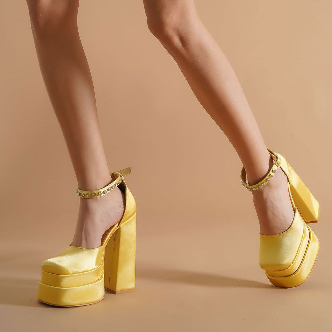 Glänzende Satin-Pumps mit quadratischer Zehenpartie und klobiger Plateausohle - Gelb
