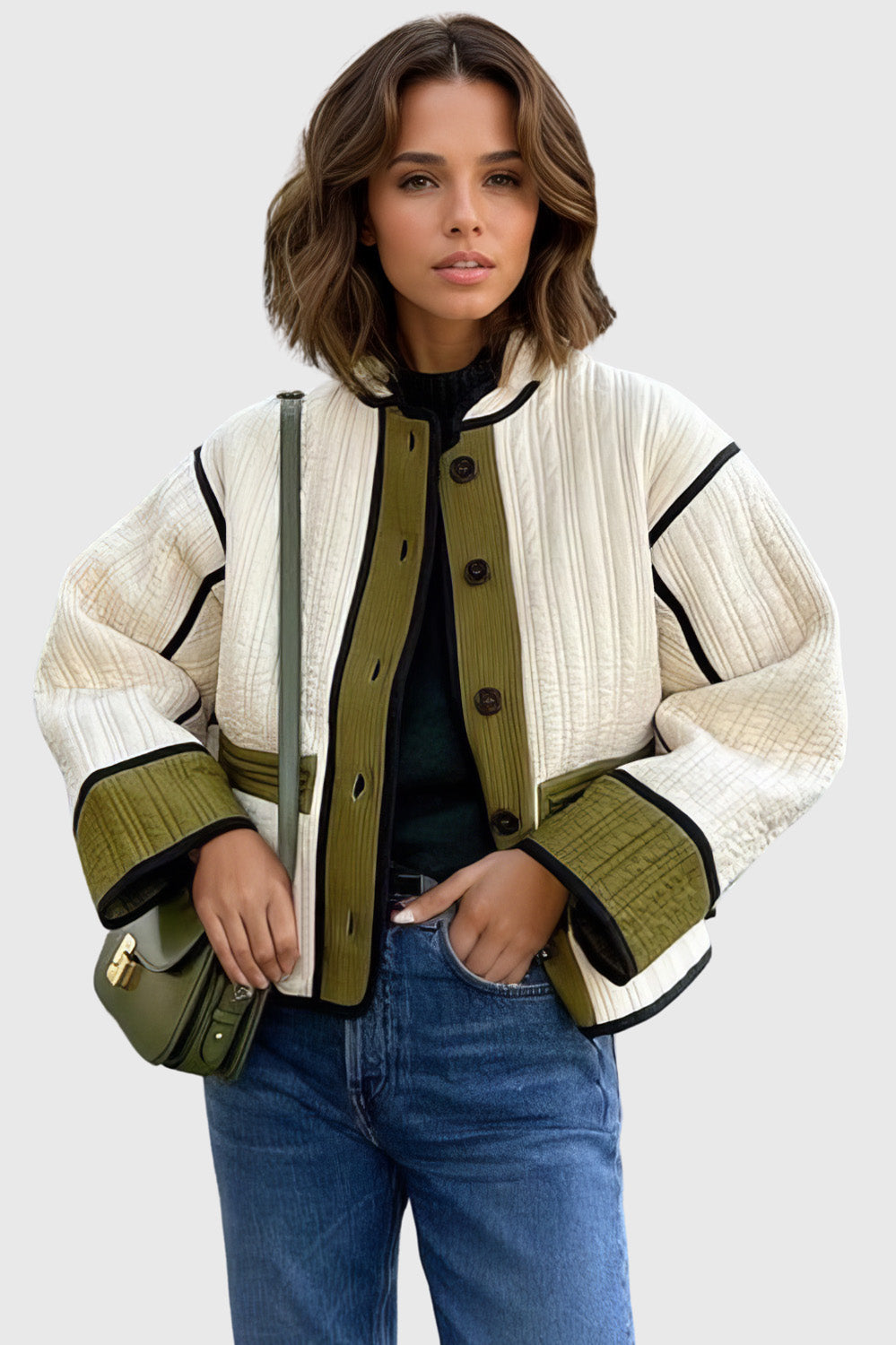 Diese kurze Jacke mit Knöpfen aus strukturiertem Stoff ist ein zeitloses Kleidungsstück und perfekt, um ein Statement zu setzen. Sie hat einen hohen Kragen, lange Ärmel, überschnittene Schultern und eine geknöpfte Vorderseite. Der strukturierte Stoff verleiht dem Ganzen ein zusätzliches Stilelement.