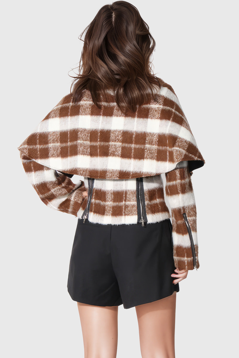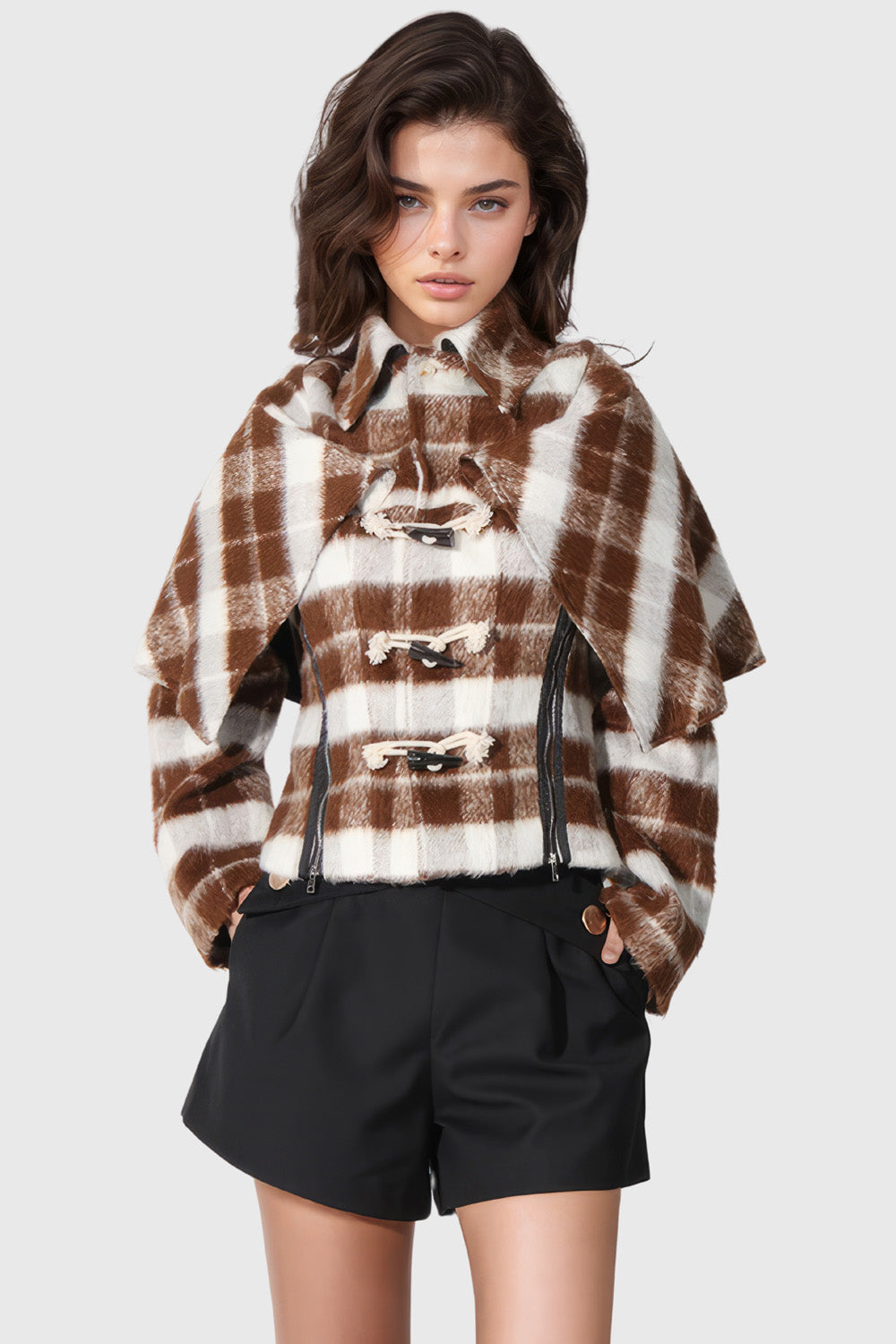 Dieser elegante, kurze, karierte Mantel ist außen mit Kunstfell besetzt. Hornknöpfe und vier Reißverschlüsse – zwei vorne und zwei hinten – sorgen für einen noch stylischeren Look. Perfekt für jede Jahreszeit. Dieser Mantel bietet die perfekte Kombination aus Wärme und schickem Stil.