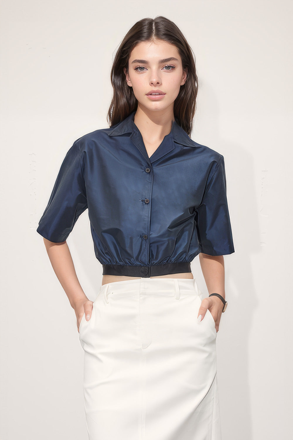 Dieses klassische Kurzarmhemd verfügt über einen Kragenausschnitt, einen Knopfverschluss vorne und einen elastischen Saum für eine moderne, verkürzte Passform.