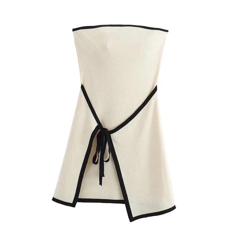 The Simone Dress is a stylish. strapless piece with a flattering fit. featuring elegant black piping details and a tie-back design for added flair.