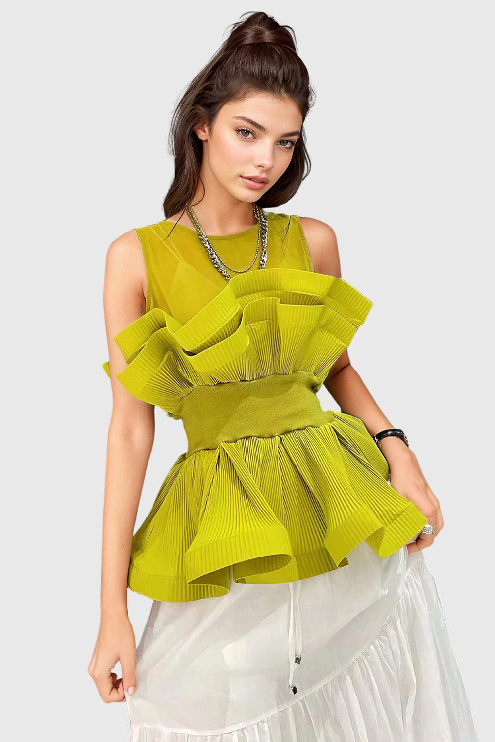 Dieses stylische ärmellose Top mit voluminöser Rüsche ist ein echter Hingucker. Der elastische Bund sorgt für eine bequeme Passform, während der Rundhalsausschnitt und der Knopfverschluss im Nacken für einen individuellen Look sorgen. Perfekt für warme Tage. Dieses Top wird garantiert zu einem Must-have in Ihrer Garderobe.
