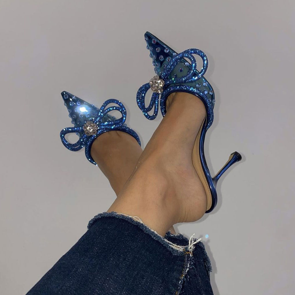 Diese schimmernden Pantoletten aus atmungsaktivem Mesh mit glänzendem Kristall-Ornament auf der spitzen Zehenpartie werden garantiert zu einem echten Hingucker. Die Doppelschleife und die glitzernden Riemen sind genau das Richtige für einen abendlichen Abend. Der leicht ausgestellte, schmale Absatz verleiht dem Schuh einen verführerischen femininen Touch. Der Slip-On-Look ist jederzeit bereit zum Ausgehen. Kombinieren Sie diese schönen Pantoletten mit sexy Minikleidern und einer Clutch mit Kettengliedern für besondere Abende.