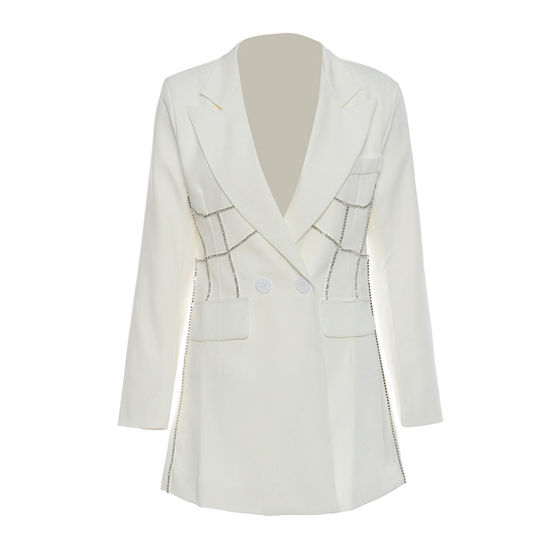 Die charakteristische Strassverzierung des Labels versprüht Glamour und zieht alle Blicke auf sich. Facettenreiche Kristalle zieren die korsettähnliche Nahtführung der klassischen Blazer-Silhouette mit schickem Revers. Zweireihiger Verschluss, lange Ärmel, Pattentaschen vorne und Prinzessnähte sorgen für einen eleganten Look. Die stark gepolsterten Schultern verleihen einen Hauch von Selbstbewusstsein und Eleganz. Dank des langen Schnitts lässt sich das Kleid auch als Blazerkleid tragen, das gerade bis zur Hüfte reicht. Profi-Tipp: Kombinieren Sie es mit Pailletten-Shorts und Heels, wenn Sie etwas mehr Bedeckung wünschen. Der perfekte Glanz für den Abend.