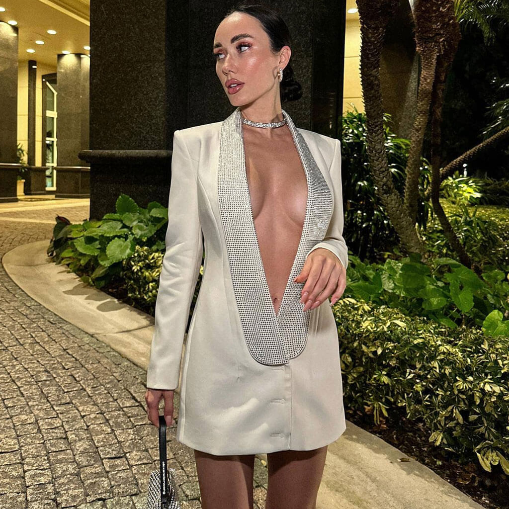 Die Kraft von Einzigartigkeit und unglaublicher Sexyness! Strahlen Sie wie ein Diamant in unserem exquisiten, mikrokurzen Blazerkleid! Dieses umwerfende Kleid ist mit schimmernden Strass-Details entlang des Schalkragens verziert und verleiht ihm einen Hauch von Opulenz und Glamour. Das sexy Kleid verfügt über einen bezaubernden tiefen Ausschnitt, der die Aufmerksamkeit auf sich zieht und Ihre Figur perfekt betont. Eine verdeckte Knopfleiste auf der Vorderseite verleiht dem Design einen Hauch von Raffinesse und Eleganz. Das Kleid hat lange Ärmel, die Anmut und Stil ausstrahlen und seinen Reiz verstärken. Der gewagte Rückenausschnitt verleiht derweil einen Hauch von Verlockung und hinterlässt einen bleibenden Eindruck. Mit seinem ultrakurzen Saum ist dieses Kleid für alle gedacht, die einen glamourösen und unvergesslichen Look suchen. Es ermöglicht Ihnen, Ihre Beine zu präsentieren und Ihr Selbstvertrauen mit Stil zu zeigen.