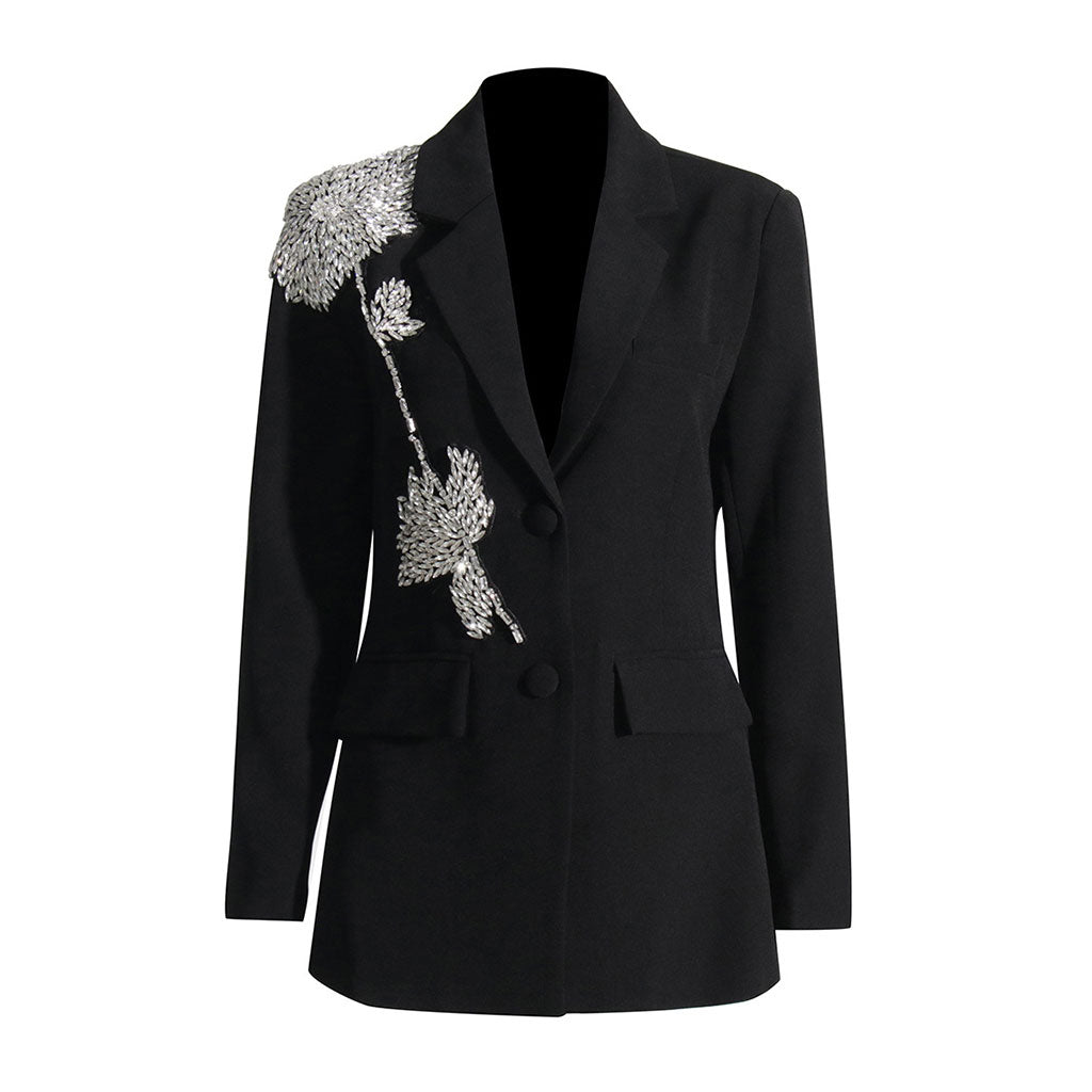 Sie wünschen sich eine festlichere Blazer-Option? Experimentieren Sie mit den Hochglanzdetails, zum Beispiel mit einem Blazer mit Kristallsteinen. Dieser Designer-Blazer in Schwarz mit Kristallrosen an der Schulter verleiht ihm einen funkelnden Glanz. Er hat Reverskragen, lange Ärmel und zwei Pattentaschen vorne. Der einreihige Verschluss wird durch einen einzelnen Knopf betont und sorgt so für bequemes Tragen. Verleihen Sie Ihrem femininen Look mit diesem einzigartigen Blazer eine neue Note und kombinieren Sie ihn mit einem langen Rock. Pumps mit Strass-Absatz runden das Outfit ab.