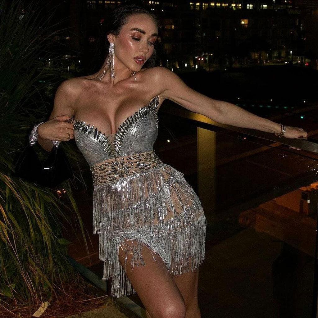 Für einen unvergesslichen Auftritt. Dieses opulente, trägerlose Designer-Minikleid bleibt mit seinem funkelnden Strassbesatz, den glänzenden Pailletten und den kaskadierenden Quasten zeitlos. Das Schlauchkleid ist mit luxuriösen Strass-Details in Metalloptik gestaltet, die das taillierte Pailletten-Oberteil betonen. Die dehnbare, hautfarbene, figurbetonte Silhouette ermöglicht Ihnen freie Bewegung, während die Paillettenquasten bei Ihrem großen Auftritt schimmern. Verschönern Sie Ihre Garderobe für Ihren nächsten besonderen Anlass mit diesem atemberaubenden, verzierten, kurzen Ballkleid.