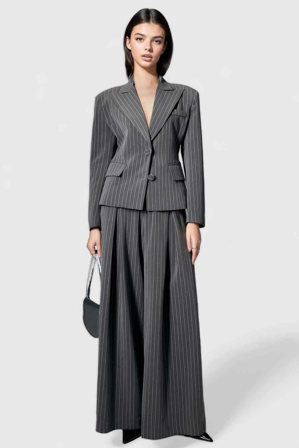 Dieses gestreifte Anzugset sorgt mit seinem bombierten Blazer, dem einreihigen Frontverschluss und der hoch taillierten Hose mit weitem Bein für einen auffälligen Look. Perfekt für formelle oder legere Business-Anlässe. Dieses trendige Anzugset sorgt für einen eleganten, zeitlosen Look.