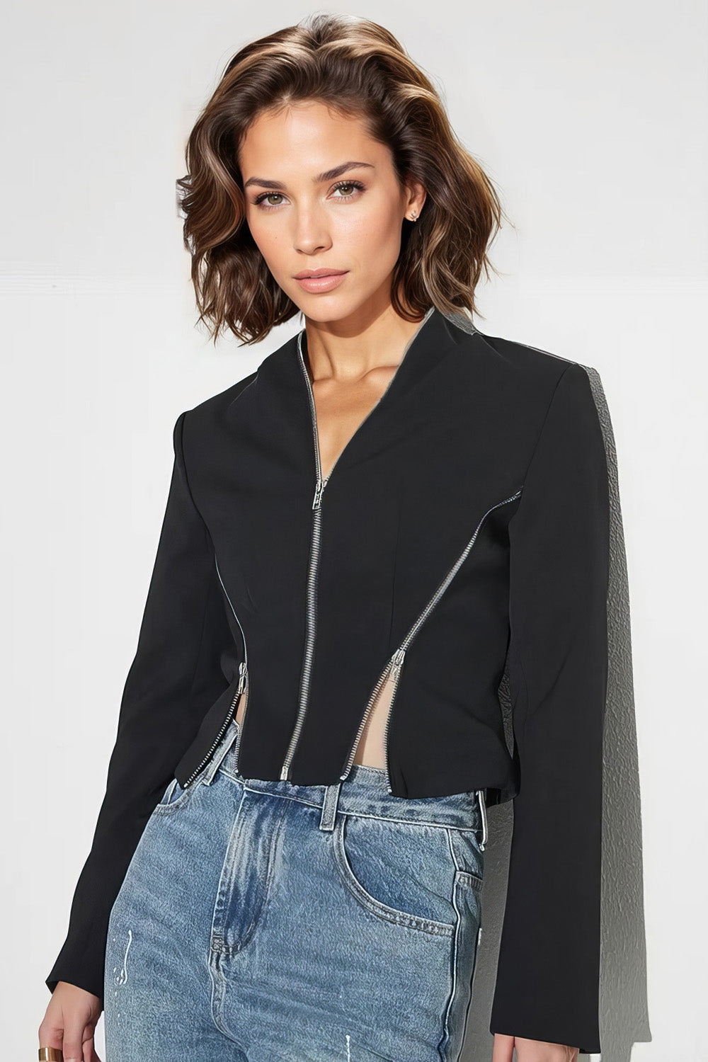 Erleben Sie Komfort und Stil mit unserer kurzen Reißverschlussjacke. Mit praktischem Reißverschluss und zwei diagonalen Reißverschlüssen für zusätzlichen Komfort. Ohne Kragen und mit langen Ärmeln ist diese kurze Jacke perfekt für den Alltag.