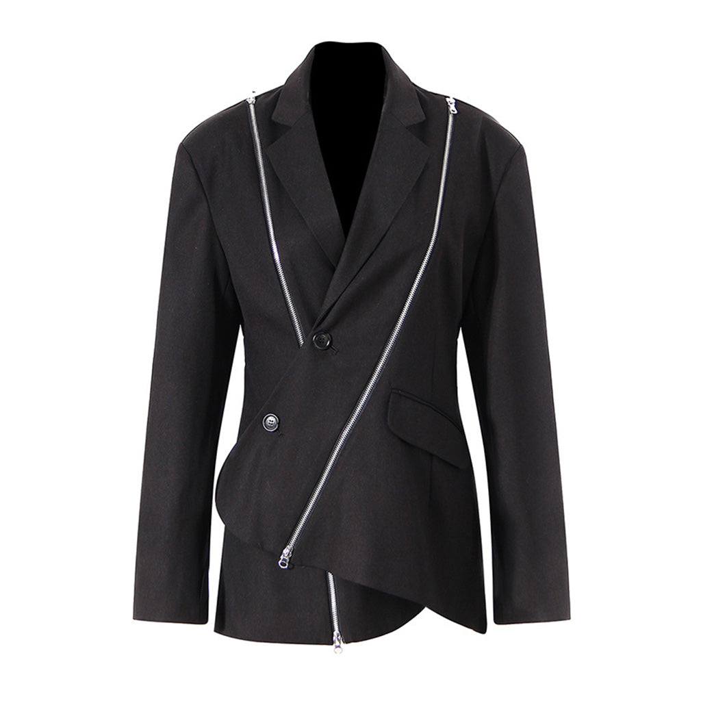 Faites une déclaration instantanée avec un blazer impertinent avec des détails accrocheurs comme les fermetures éclair ici. Cette saison, notre marque de créateur adopte l'innovation grâce à son approche méticuleuse de l'esthétique déconstruite. Produit dans des teintes noires et blanches intemporelles, le blazer se distingue par la fermeture éclair argentée qui traverse le devant et le dos. Le col à revers chic, les manches longues et les épaules structurées en font une pièce classique. tandis que les boutons à simple boutonnage sont asymétriques, ce qui maintient la coupe moderne avec une touche futuriste unique. Choisissez l'une de ces couleurs et essayez-la avec une jupe crayon tout aussi audacieuse et des bottes élégantes pour faire passer l'ambiance au niveau supérieur.