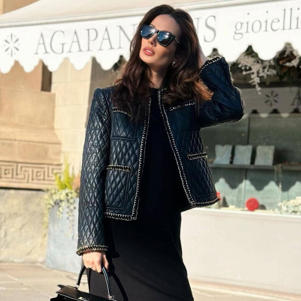 Affrontez l'hiver avec style grâce à cette veste en similicuir d'inspiration motard. Ses manches longues, ses épaules structurées et ses boutons en métal doré aux poignets dégagent une ambiance puissante. Cette veste matelassée cool est agrémentée de bordures en chaîne métallique dorée pour une touche de luxe. Sans col, avec une coupe droite courte et quatre poches plaquées avec bordure en chaîne. C'est un mélange d'audace et d'élégance. Associez-la à notre minijupe matelassée Golden Time .