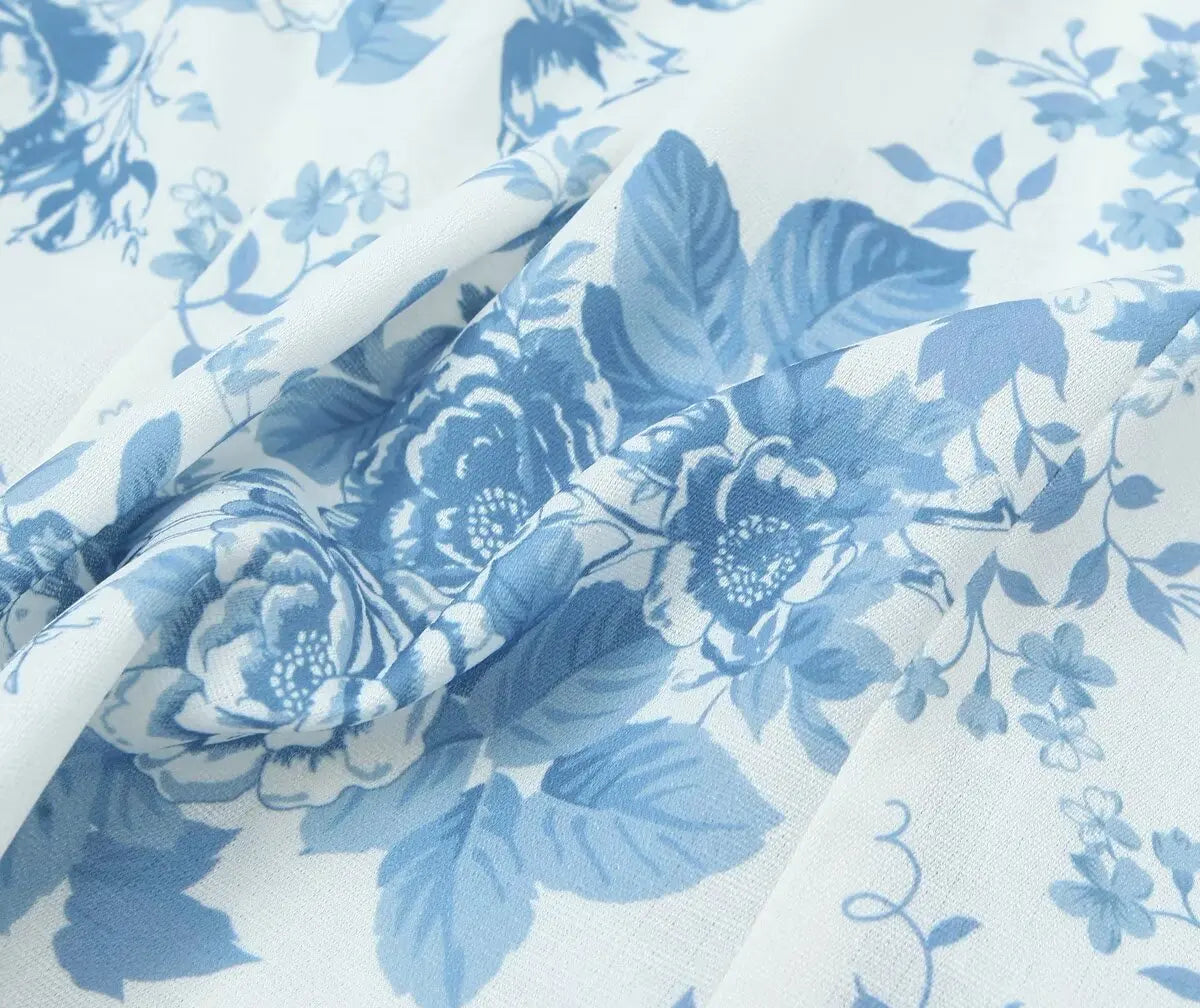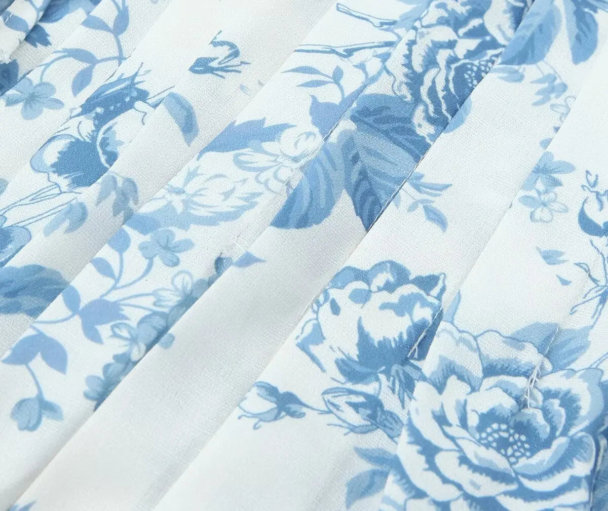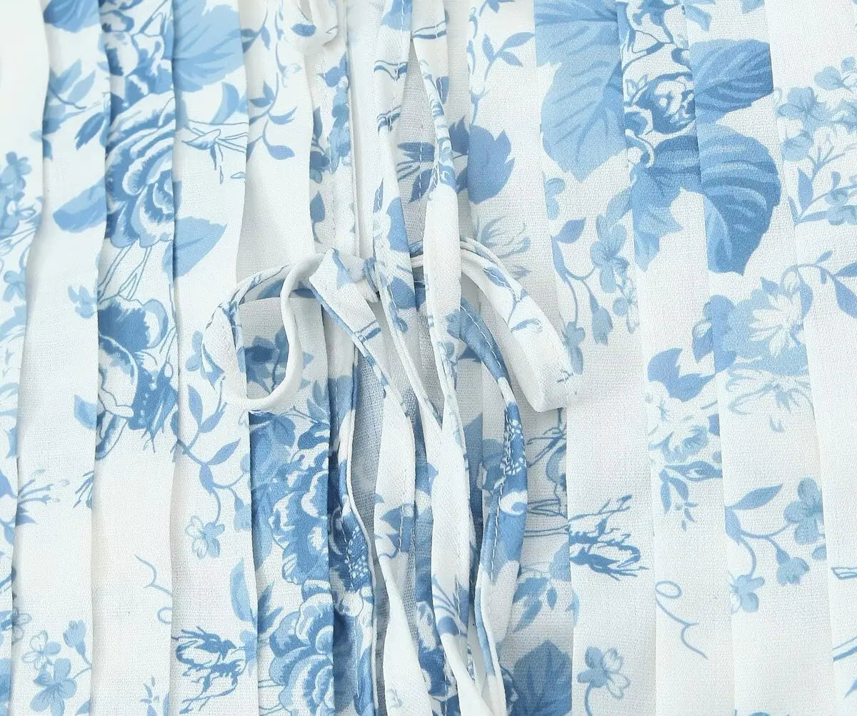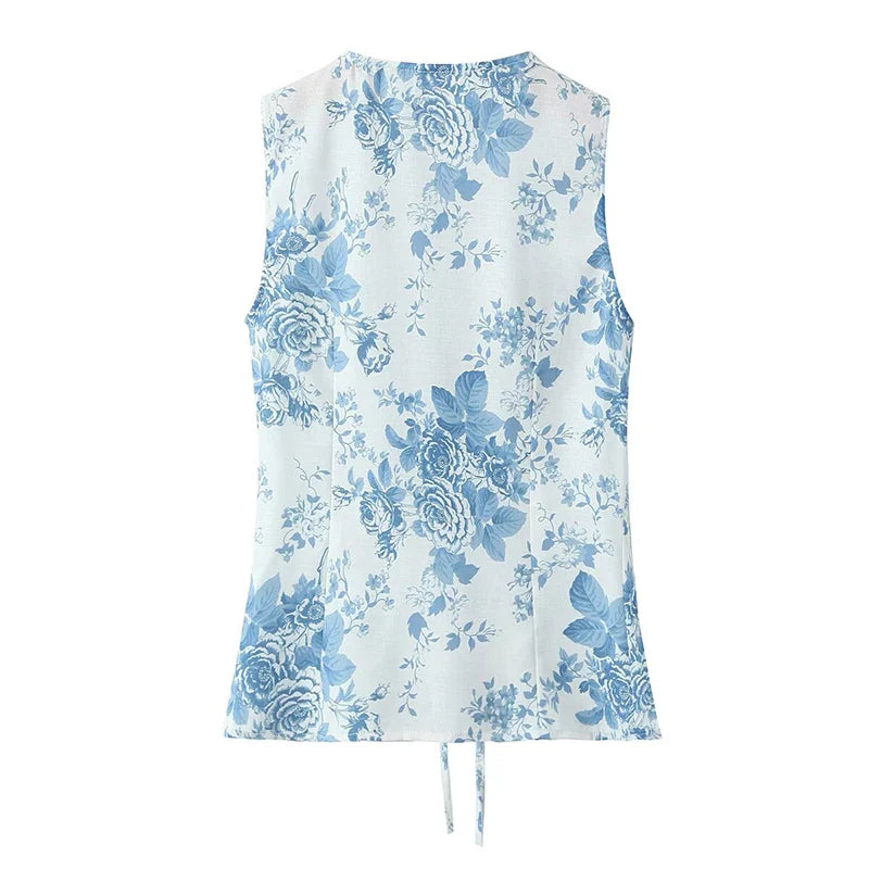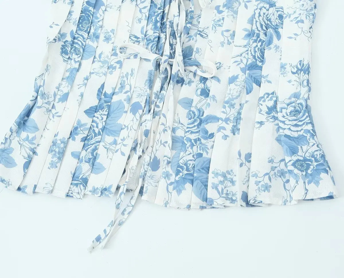 The **Blueberry Top** is a sweet and stylish piece that combines pleats with a delicate floral pattern. This sleeveless top is perfect for warm days and pairs well with any casual outfit. The ties at the front add a playful touch to its design.