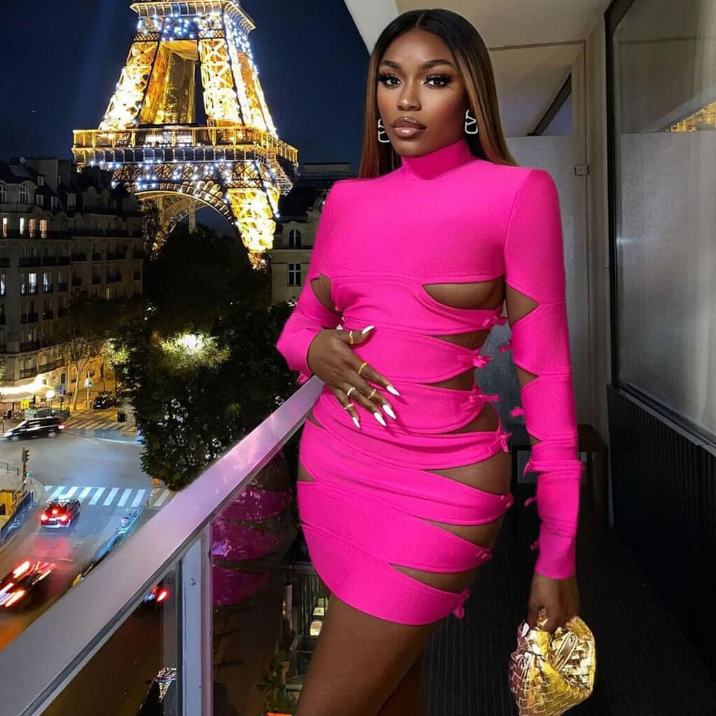 Jouez avec la nuance rose vibrante de la tendance fuchsia cette saison. La mini-robe est confectionnée avec un tissu bandage extensible pour une silhouette flatteuse. Juxtaposez-la avec le col montant modeste. La robe séduisante est ornée de découpes sexy sur les côtés et les manches. Tandis que le petit nœud décoratif confère une ambiance féminine à cette pièce. Dotée d'une fermeture zippée dissimulée à l'arrière pour un enfilage facile, cette robe tendance est sûre de donner à votre look un attrait exceptionnel. Faites une déclaration audacieuse avec un look ton sur ton en ajoutant des escarpins à talons épais pour une touche de féminité parfaite.