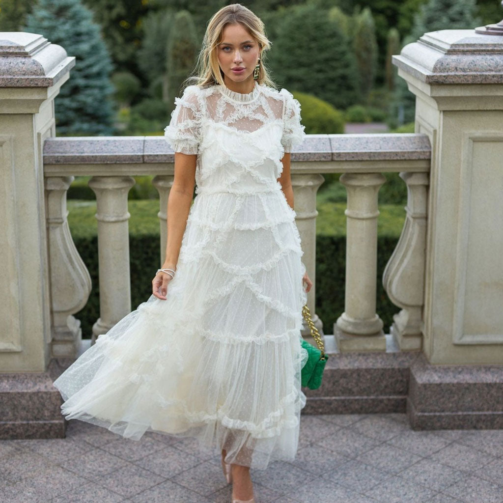 Cette robe en tulle de style français Luxedress pour le printemps et l'été est la vraie affaire pour votre grand jour ! De la collection de robes de conte de fées du créateur. Cette sensation à pois scintillants est un spectacle. Avec un corsage partiellement doublé avec un col montant à volants séduisant. fermeture éclair arrière discrète. manches courtes transparentes. et cette jupe trapèze à superpositions. tout est question de ce style élégant et aéré. Mais voici le hic : les volants ludiques sur la silhouette douce ajoutent ce petit plus de charme ! Disponible en bleu. blanc. ou ivoire. cette robe florale est comme une bouffée d'air frais pour votre journée spéciale.