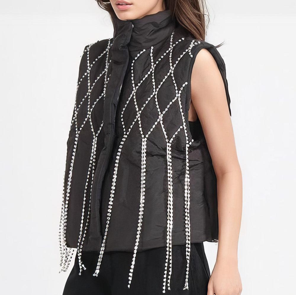 Ce gilet matelassé est doté d'un ourlet élastique court, d'épaules tombantes, d'un col haut et d'une fermeture à glissière dissimulée. Il est orné de strass scintillants pour une touche sophistiquée.