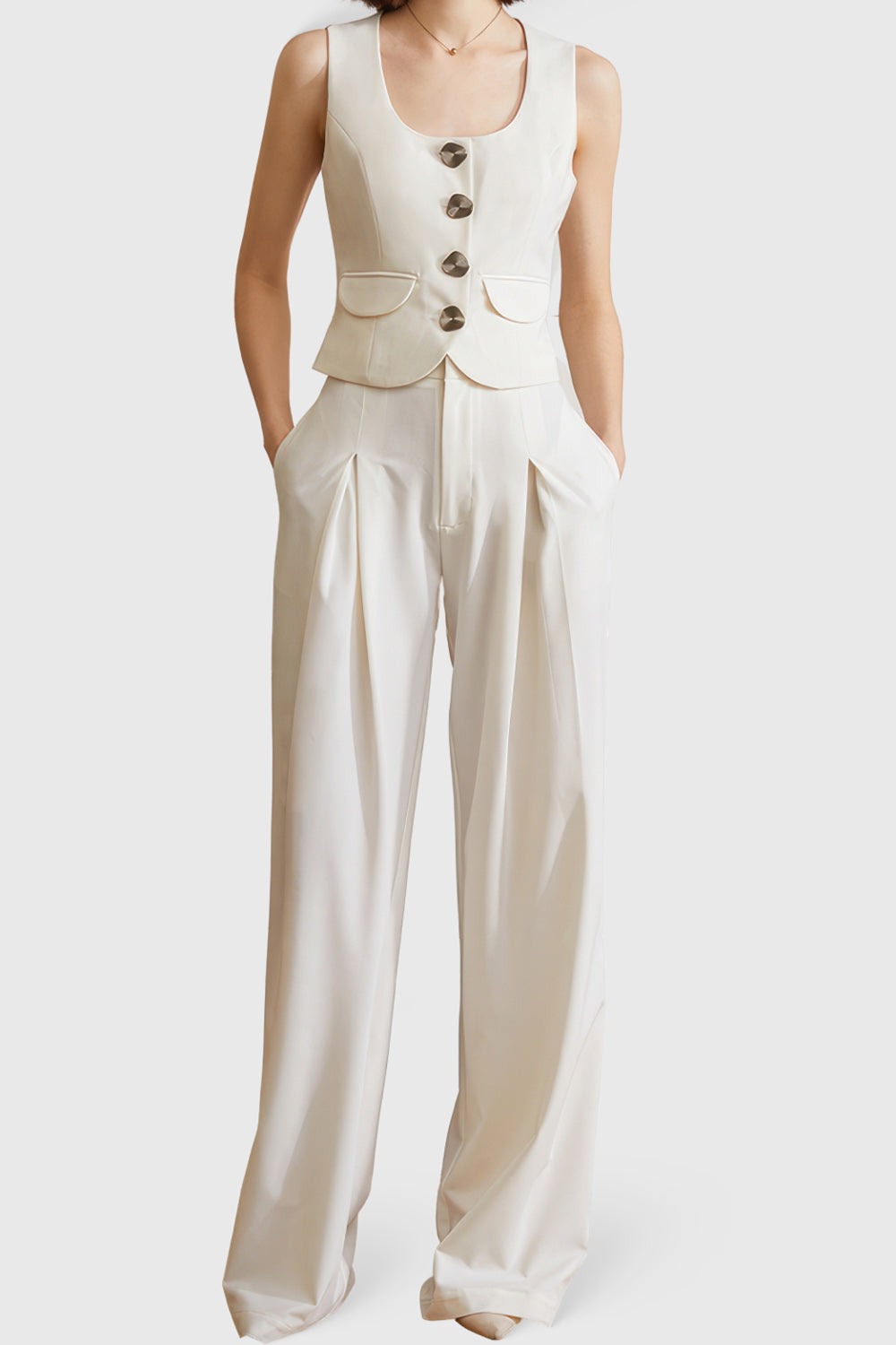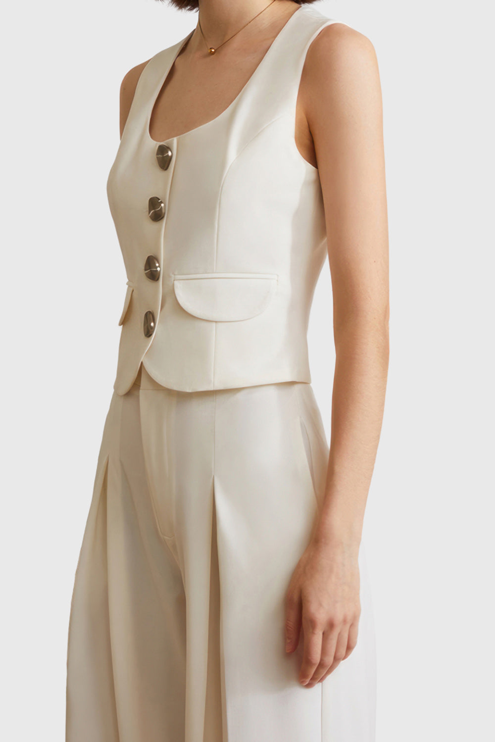 Gilet de costume à encolure carrée et boutons. Le gilet possède deux rabats de poche sur le devant.