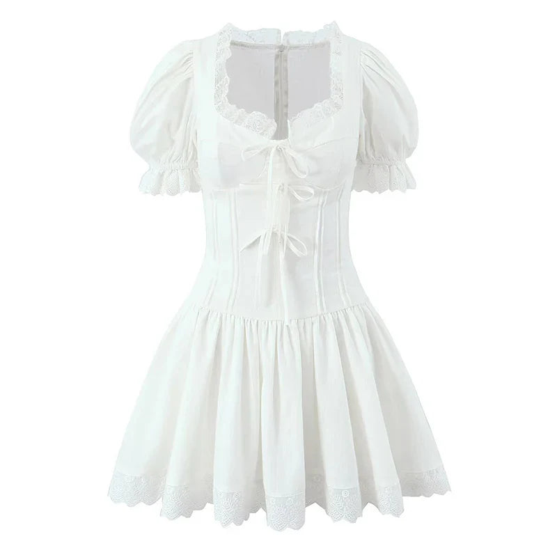 The **Velvet Cream Dress** is a sophisticated and elegant piece. featuring delicate puff sleeves and a flattering fit-and-flare silhouette. The bow detail at the front adds a charming touch. making it perfect for day-to-night wear. Ideal for formal events or an evening out with a soft. feminine touch.