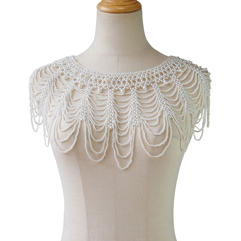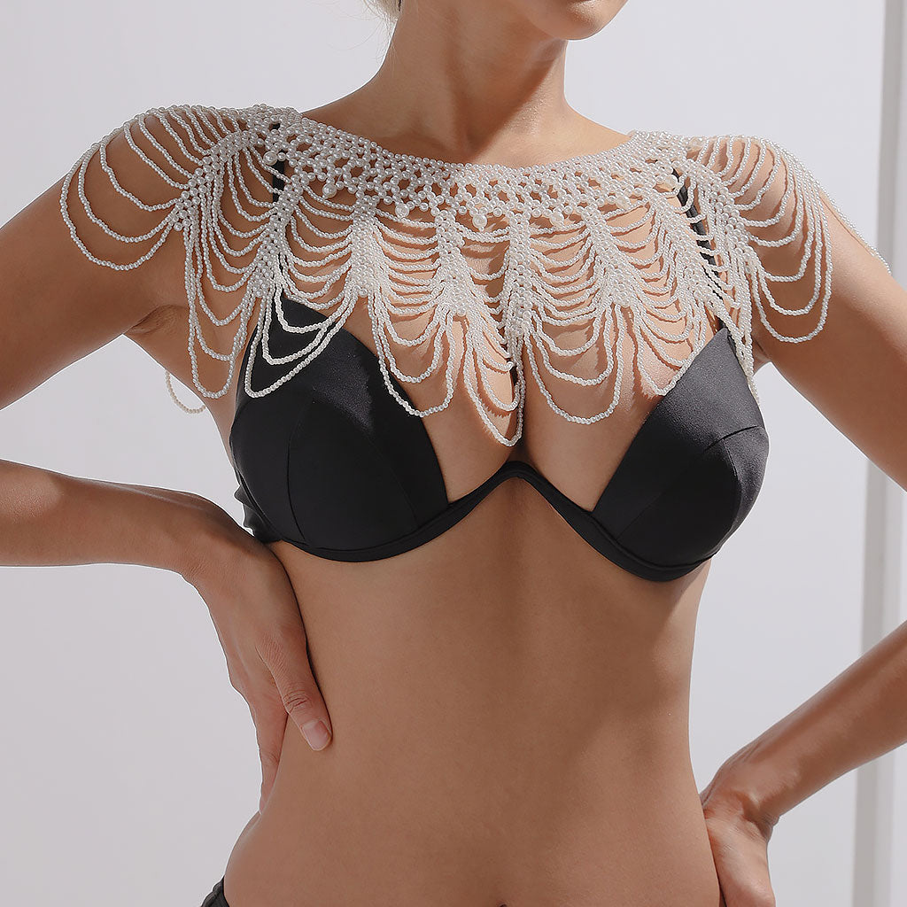 Ne soyez pas timide. Démarquez-vous de la foule avec notre chaîne de corps en perles de créateur ! Dotée d'un décolleté bateau tressé méticuleusement conçu et de chaînes de perles multicouches en cascade, cette cape en fausses perles nacrées respire l'opulence et le charme. Vous assurant de vous démarquer de la foule.