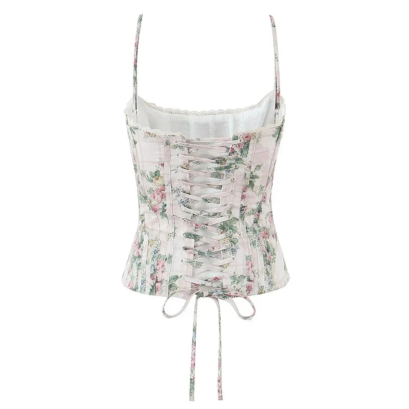 The Viola // Corset is a delicate floral-print piece with vintage elegance. Featuring soft boning. dainty lace trim. and adjustable tie-front detail. this romantic silhouette is made for poetry readings. pressed flowers. and slow Sunday mornings.