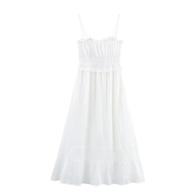 The Angele // Dress is a dreamy and delicate midi dress featuring soft shirring across the bodice and ruffled accents. With its flowy skirt and lightweight texture. it's a romantic staple for your summer wardrobe.