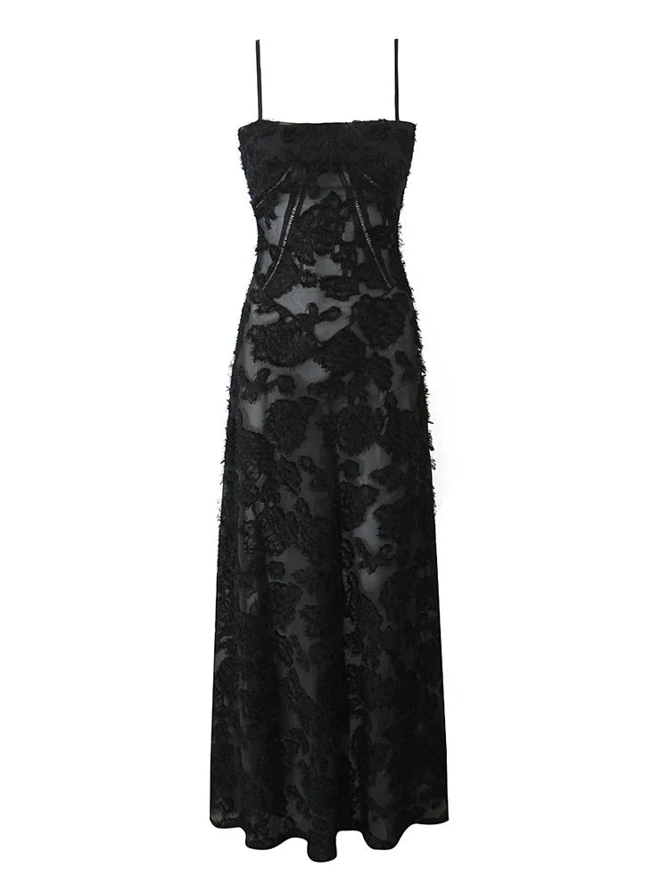 The Angelica Dress is a stunning. floor-length gown featuring elegant lace detailing. perfect for formal occasions and evening events.
