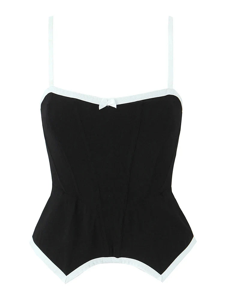 The Anna // Top is a structured black corset-style piece with soft contrast trim and a dainty bow detail. With a sweetheart-inspired neckline and pointed hem. it's your go-to for both bold layering and statement solo looks.
