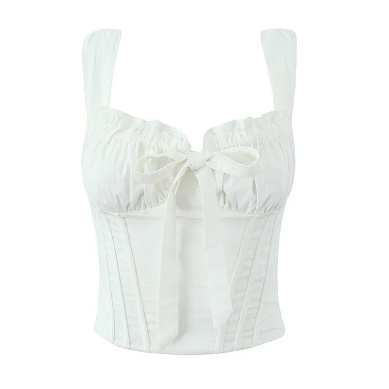 The **Aperitif Top** is a sweet and elegant piece. designed with a cute bow at the front and a structured fit. It features a flattering sweetheart neckline and is perfect for pairing with skirts or pants for a chic. casual look.