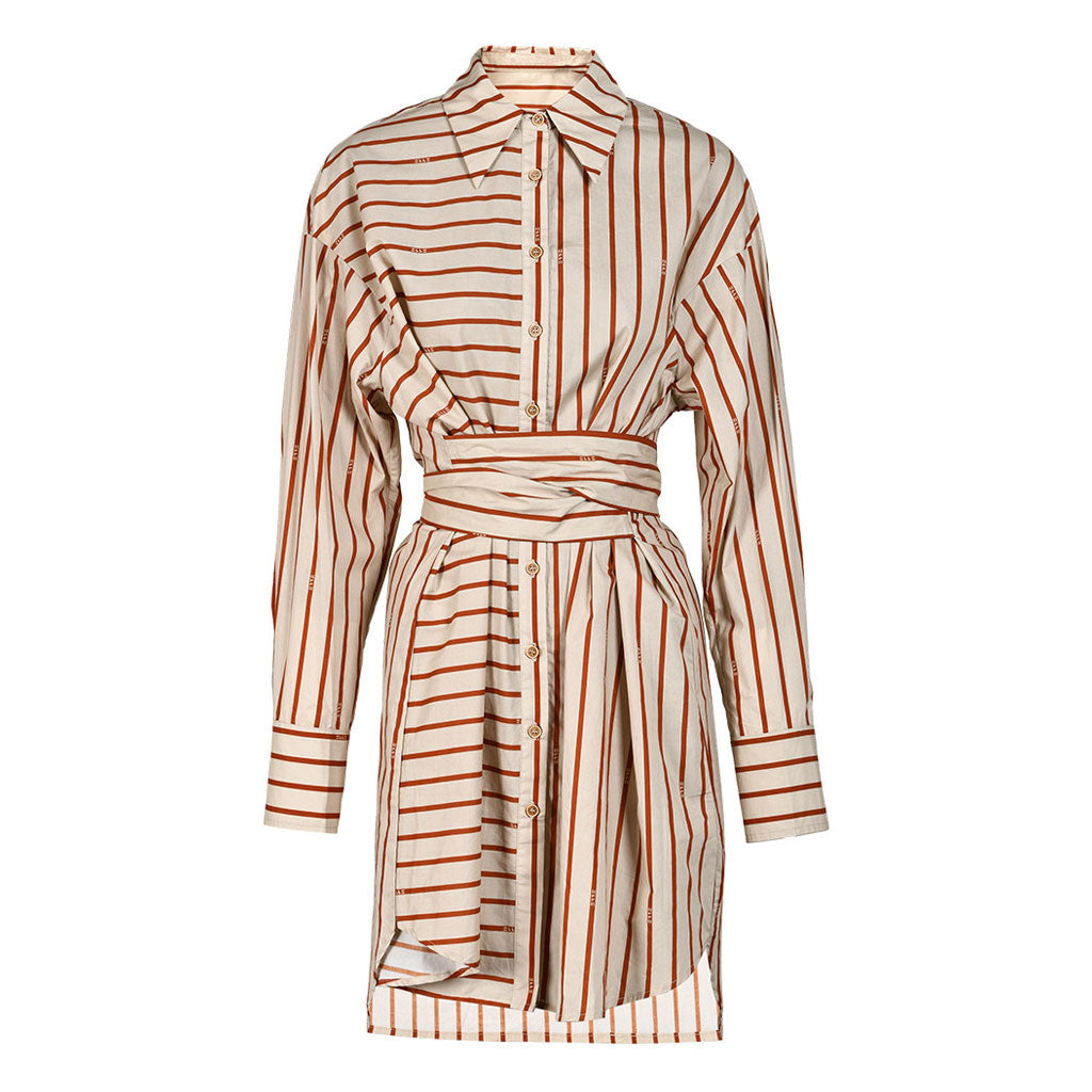 Picture yourself draped in timeless elegance with our retro-style designer shirt dress. adorned in a captivating orange-red and white colorway that boldly contrasts against a backdrop of dynamic stripes. The sharp pointed collar and gracefully dropped shoulders on the long sleeves exude an air of effortless sophistication. while the functional button-down placket adds a touch of timeless charm. The accompanying belt cinches your waist. creating a flattering oversized silhouette that captures attention. As you move. the high-low hemline dances with the rhythm of your steps. adding a modern flair that harmonizes with the dynamic stripes in the background.