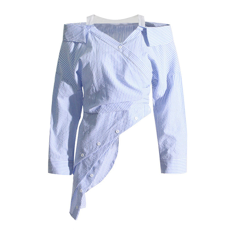 Quirky motif comes back this season from our designer brand. Effortlessly deconstructed with the menswear inspiration. the unique blouse is impeccably tailored and finished with asymmetric gatherings and chic wrapped effect at the waist and back to highlight the curve of your shape. It falls off-the-shoulder with the sheer mesh shoulder strap inserted. while cuffs and folded collar add classic shirt style to the design. imbuing a modern appeal. It's available in solid white and blue stripes. Concealed side zip fastening is included. Get ready to up your fashion game by pairing it with skinny jeans and heels. Yes. you've got the best spring look.
