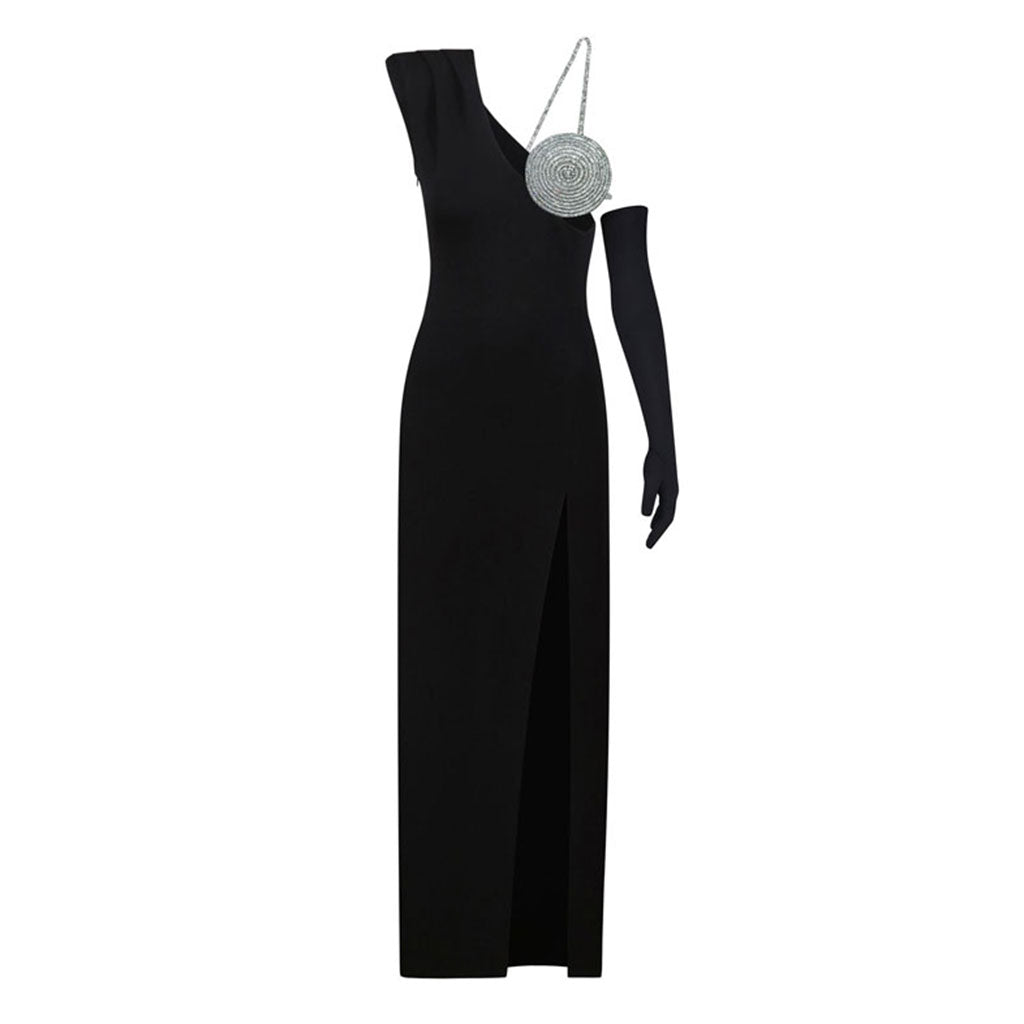 To give your dress a choice of futuristic twist. this little black dress is your top pick for having fun on the party night out. Made from thick bandage material with just the right amount of stretch. our designer piece is cut in an asymmetric one-shoulder silhouette with a pleated shoulder and sweeping across the chest with a sparkly crystal spiral bra for a high-shine detailing. Featuring a side concealed zip fastening. it skims over the knee with an ultra-high split. allowing you to show off the flattering leg every time you take a step. The matching opera glove exudes a unique rebellious spirit. Take cues from the model by pairing yours with a sphere clutch and heels for an unforgettable evening night out.