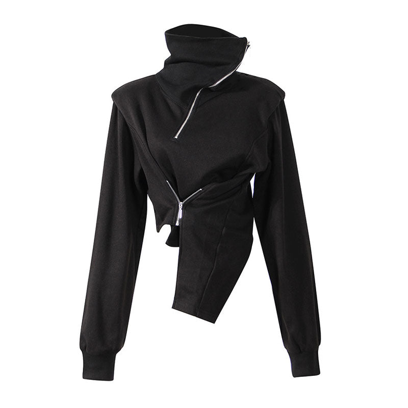 This crop top is one of LUXE's most popular items. with all the creative elements that make you stand out from the crowd. The unique designer top is highlighted with the diagonal zip closure on the neck and hem. which allows to personalize the style and fit. The long-sleeved top is enhanced with strong shoulder pads that add a nice accent. Its asymmetric cropped length makes it a more feminine style that allows it to match with a variety of bottoms. expanding the width of your wardrobe with multiple activities.