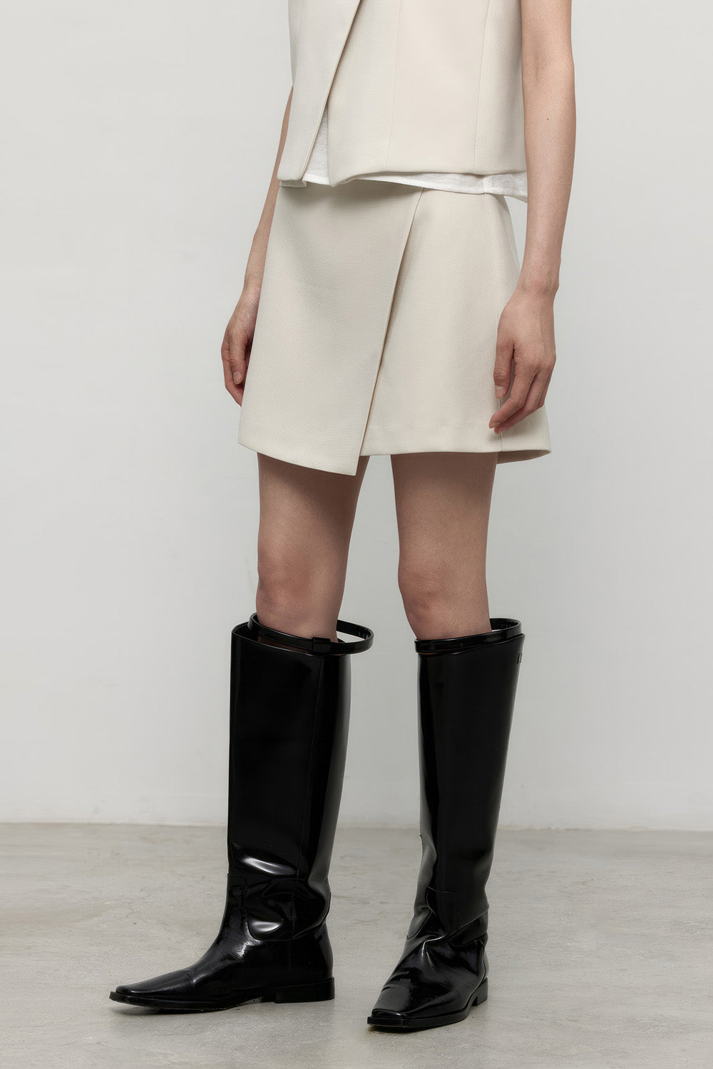 This Asymmetrical Mini Skirt in Beige offers a high-rise cut with a relaxed and minimalist design for a versatile look. The asymmetrical shape provides an unique spin to complete your chic outfit.