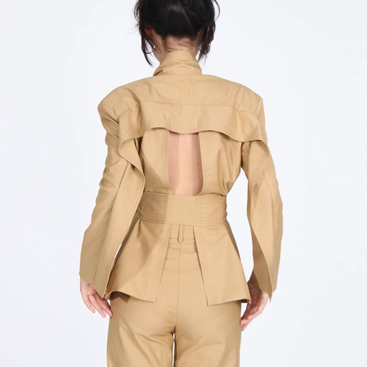 This Blazer with Belt and Back Cut features a V neckline. long sleeve design. adjustable belt around the waist. a back cut. and a long scarf detail around the neck. tailored for a great fit. It is truly the perfect piece for a sophisticated. timeless ensemble.