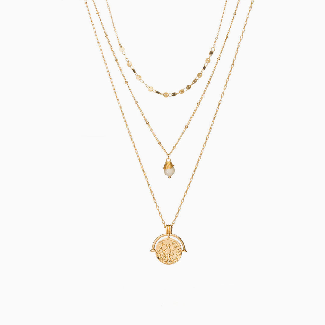 Express your personality and make a fashion statement with this layered necklace. Crafted with gold plated alloy. embellished with in a polished bead and gold-tone coin charms. featuring a treble-strand chain along with an adjustable fit and finished with a lobster-clasp fastening. Find more trendy women's necklaces and accessories in our boutique. and mix and match with other unique gold chains for a stylish look.