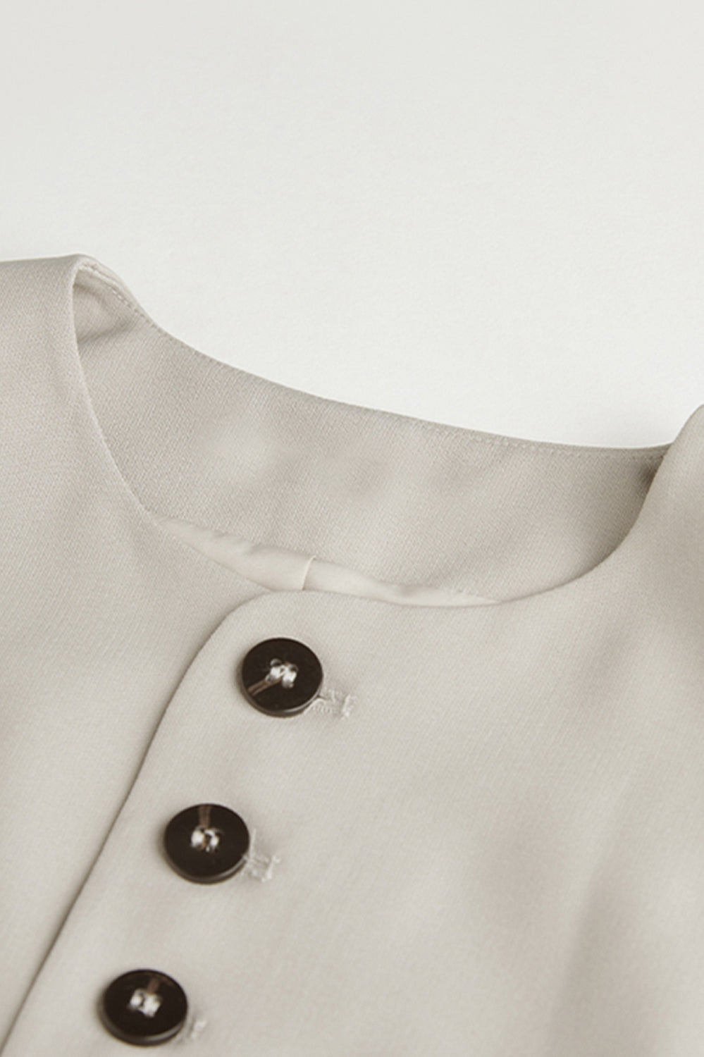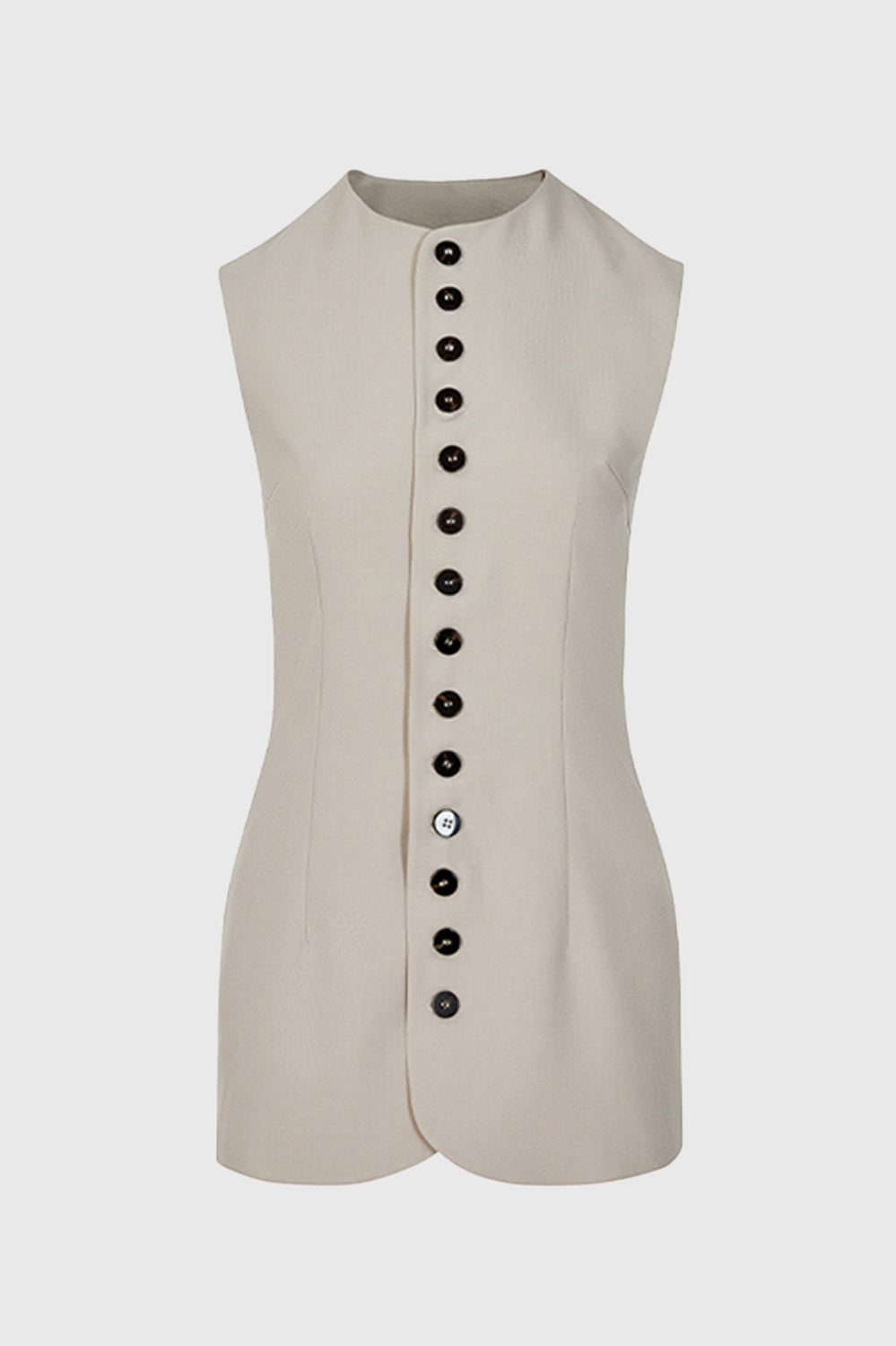 This classic buttoned waistcoat offers a traditional look with a twist. The round neckline. full button placket. and cambered fit combine for a timeless design. Enjoy a timeless look with added convenience with the included buttons along the front.