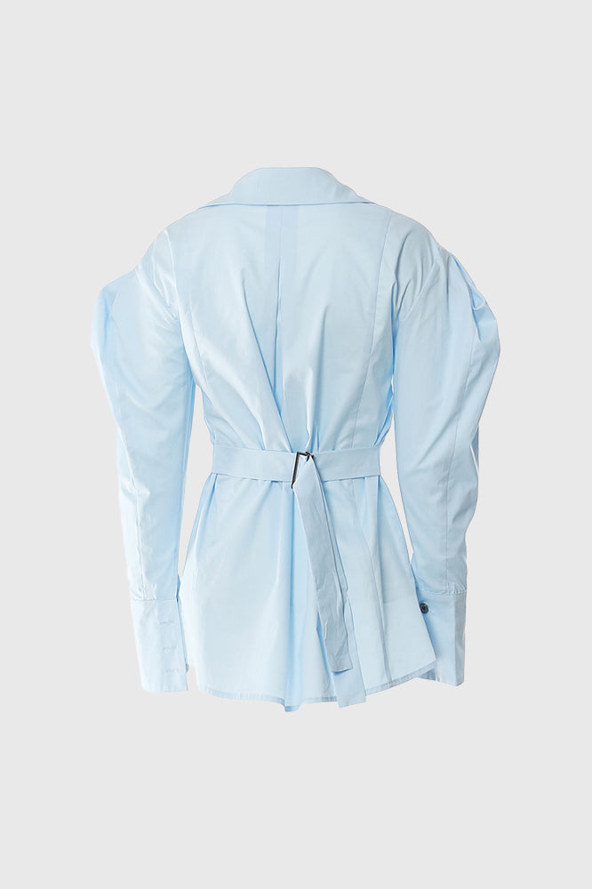 This cambered shirt is designed with a flattering fit and contemporary details that will elevate any look. Features include a square neckline. buttons. dropped shoulders. extra long sleeves. and a collar. Enjoy an effortlessly stylish look with this unique shirt.